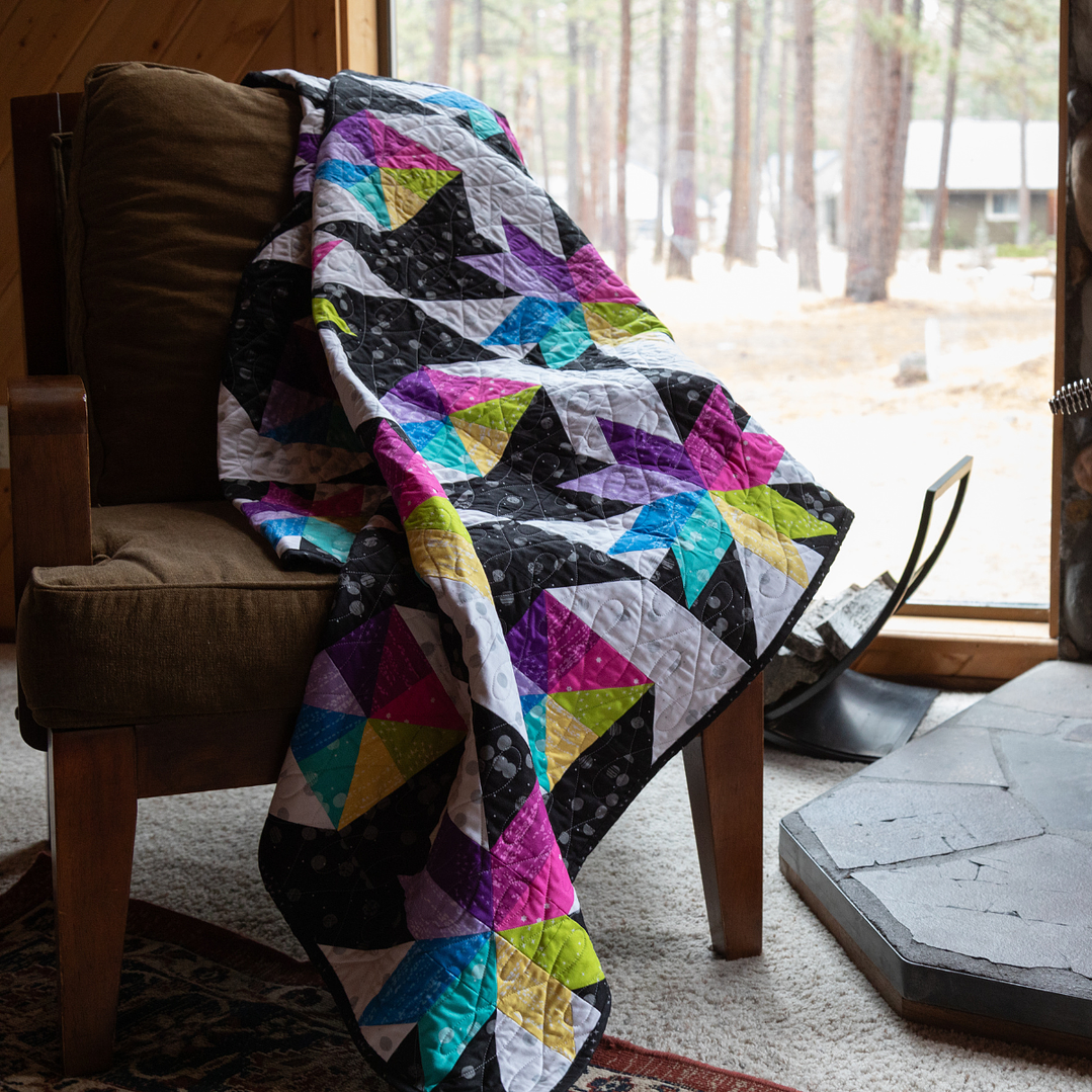 This design is inspired by traditional Storm at Sea patterns, without the hassle of half-rectangle triangles! Instead, you'll make quick work of these blocks by making half square triangles (HSTs) using the 8 At A Time Half Square Triangle (HST) method. The HSTs are slightly oversized so you can trim each one down to the right size, perfection not needed! By the time you've finished this quilt, you'll have all the confidence you need to tackle any HST pattern in the future.